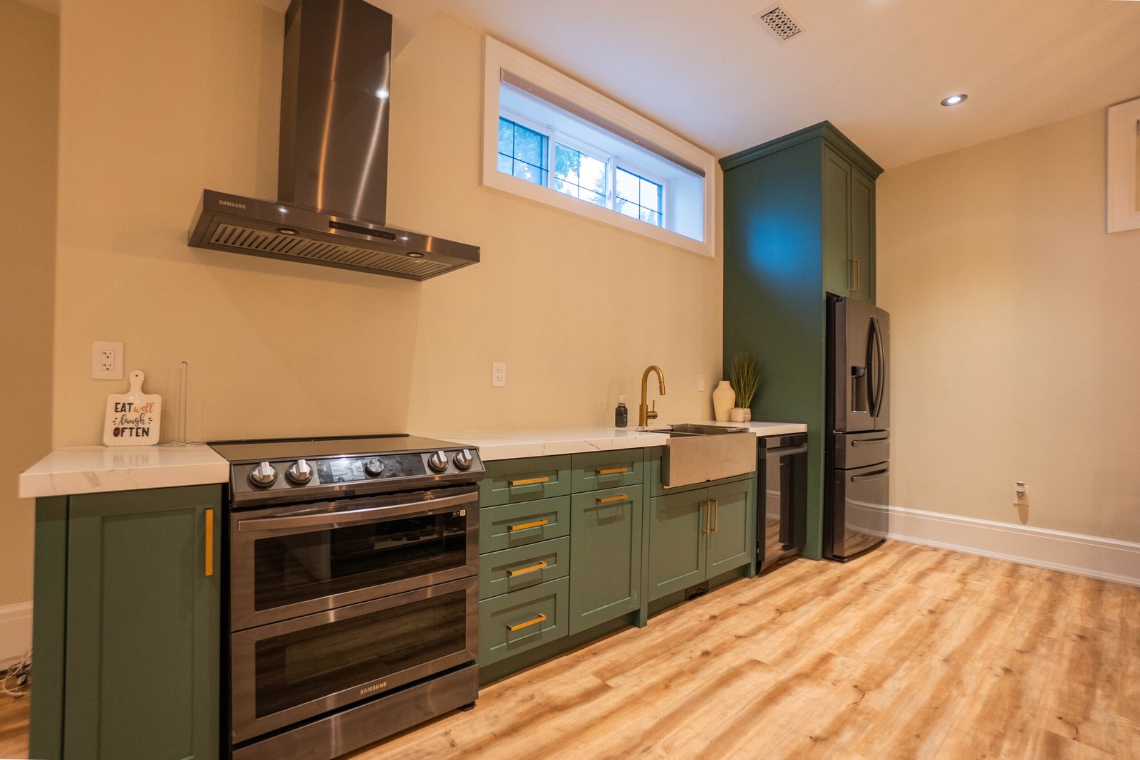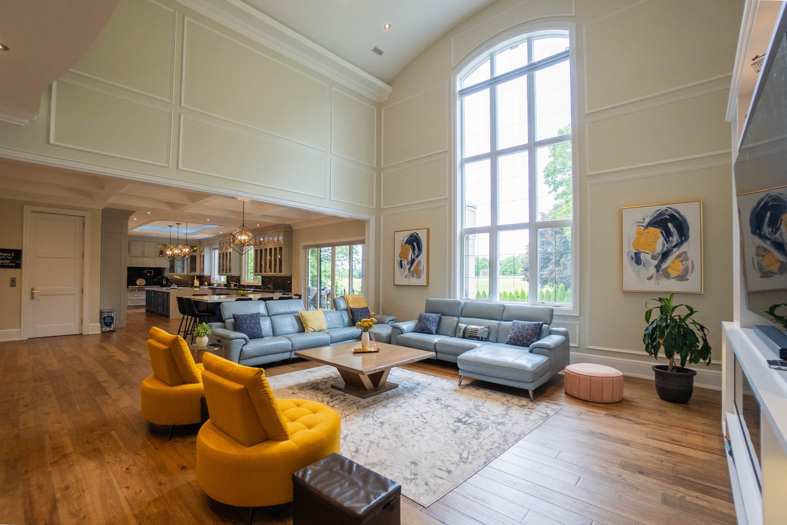 Rich hand-scraped hickory engineered floors flow throughout, adding warmth and elegance to the expansive open-concept layout.